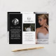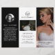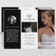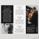 Dépliant moderne en trois volets pour la photographie présentant vos photos préférées dans un design élégant en noir et blanc. Le panneau avant comporte une photo pleine page ainsi que deux lignes de texte sur une bannière transparente en bas. Le panneau arrière extérieur comporte votre logo et une ligne de texte au-dessus d'une photo horizontale et vos coordonnées en dessous. Ajoutez votre portrait et votre biographie au panneau qui se repliera dans le dépliant. L'intérieur comporte une image sur les panneaux gauche et droit ainsi qu'un modèle pour les informations à gauche, vos forfaits au milieu et une liste de prix à la carte sur le panneau droit. Ce dépliant professionnel en trois volets est parfait pour un photographe de mariage.