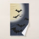 Ensemble de serviettes de bain salle de bain et décoration de la maison accessoire avec Pleine lune Halloween Avec chauves-souris dessin de TheFabricSeal à Zazzle.com est un dessin d'illustration avec les yeux de chauve-souris à la recherche d'amis et de proies ainsi qu'une nuit d'Halloween sombre cool de l'aventure, gobelins, goules, et tricoter ou traiter des bonbons. Les chauves-souris noires volantes en vol nocturne sont en force pour leur vol d'Halloween. Extraordinaires anneaux auroraux circulaires concentriques brillants autour de la pleine lune avec des couleurs crème jaune et blanc tonique moisson lune brillant, ciel foncé bleu et noir foncé et les couleurs noir jet des chauves-souris volantes. Cette conception d'image a été incorporée à deux versions abstraites de motif répétitif et d'apparence cool figurant dans la boutique.