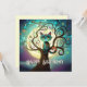 Un chat assis dans un arbre sur une pleine lune avec un ciel bleu turquoise et violet rempli d'étoiles et de fleurs. Chateau vert turquoise avec taches colorées. Peinture d'art numérique Whimsical moderne d'origine. Joyeux anniversaire.