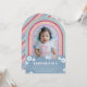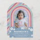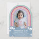 Invitations amis et famille à la fête d'anniversaire de votre enfant avec cette invitation simple, mais adorable rétro-thème de fête. La carte comporte une photo d'enfant encadrée par un arc-en-ciel coloré. Les détails de l'événement sont placés sur une conception de nuage simple, et entourés d'une poignée de marguerites. L'arrière de la carte est muni d'un motif à bandes diagonales pour coordonner les couleurs. Cette invitation serait également parfaite pour un baby shower !