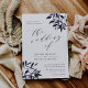 L'invitation de mariage rustique et élégante comprend des lettres riches en noir cassé dans le bloc chic et en italique avec des accents calligraphiques, avec des sprays de l'aquarelle feuillage de chute aux coins dans les teintes de récolte d'automne de prune violet et bleu minuit. Les invitations se renversent en bleu marine solide.