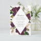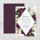 Cartes élégantes et élégantes pour l'enceinte de mariage avec détails de réception de mariage entourées d'un cadre de prune foncé et de fleurs d'aquarelle blanches accentuées de feuille d'or rose et de feuilles verts. Personnalisez la carte en ajoutant des informations importantes telles que l'heure de réception, l'emplacement, etc.