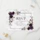 Moderne et tendance, cette carte postale RSVP faire-part de mariage présente une aquarelle de verdure eucalyptus et des arrangements floraux prune violet, avec une texture imitation marbre blanc, avec "RSVP" dans une couleur prune assortie. Fait partie d'un ensemble de mariages correspondant. Copyright Invitations élégants. Tous droits réservés.
