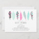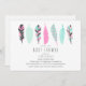 Ce design présente sept plumes aztèques dans les tons fusain, aqua et rose en haut de l'invitation et les détails de la fête en bas. Les champs de texte sont entièrement personnalisables. Graphiques ©Huckleberry Hearts