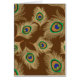 Carte de note dans un dessin de plumes de paon, rehaussée et rendue dans un effet d'écrémage de côte doux - beige doré doux et plumes tan, avec rouille, bleu cobalt, et oeil vert émeraude, sur un chocolat brun