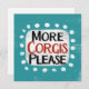 "More Corgis Please" est un joli design de texte en bleu avec du texte en noir et rouge, avec une forme d'accent blanc et des points blancs à texture blanche.