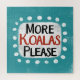 "Plus de Koalas Please" est un joli design de texte en bleu avec du texte en noir et rouge, avec une forme d'accent blanc et des points blancs à texture blanche qui l'entourent.