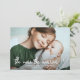 Carte de faire-part de naissance moderne de Noël avec typographie à lettres à la main qui dit "plus le plus le plus heureux" avec un coeur. C'est une carte faire-part de naissance pour les saisons de vacances ! Ajoutez vos photos, vos statistiques de naissance et un message !