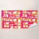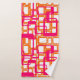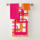 Ce kit de serviettes est doté d'un linge orange, d'une serviette rose à la main et d'une serviette de bain au design moderne du milieu du siècle, de rectangles ouverts en rose sur des rectangles ouverts en orange.