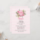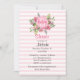Invitation baby shower rayé rose, avec un joli arrangement de fleur de pivoine rose en haut, avec un disque rose au milieu avec du texte. Personnalisez tous les champs de texte de votre événement baby shower.