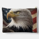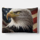Aigle à tête blanche en alerte devant un drapeau américain agitant.