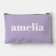 Sac d'accessoires cosmétiques chic avec votre nom ou vos initiales monogrammed dans une grande police blanche populaire sur un arrière - plan violet lavande pastel. Vous pouvez ajuster la taille de la police dans l'outil de conception pour des noms plus courts ou plus longs. Un cadeau parfait pour vos demoiselles d'honneur et vos invités de bachelorette.