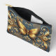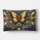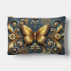Une représentation artistique d'un papillon doré orné entouré de fleurs élégantes et de volutes ornementales sur un fond bleu contrasté, renforçant les thèmes de luxe, d'élégance et de décoration.