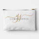 A stylish gold script monogram pouch featuring a flowing signature style initial paired with a clean name layout. The simple gold lettering creates a polished look while keeping the design minimal and easy to read. A practical and personalized choice for organizing makeup, travel essentials, or small accessories. Also makes a thoughtful personalized gift and works beautifully as a bridesmaid gift for weddings and bridal parties.