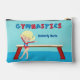 Ce mignon sac cosmétique de fille gymnastique ou sac accessoire présente une jolie fille gymnaste blonde debout devant un poutre. Cette petite fille porte un leotard rouge et sourit au-dessus de son beau nom bleu personnalisé.