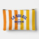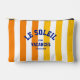 Le sac accessoire personnalisé parfait pour vos essentiels de vacances... rayures de cabane orange et jaune avec lettrage bleu "Le Soleil Vacances Côte d'Azur". Personnalisez votre destination de vacances. Idéal pour des vacances en groupe, une soirée bachelorette à thème sur la plage française ou comme souvenir pour un voyage passé. Accessoires correspondants disponibles dans la Collection Cabana Le Soleil Vacances Côte d'Azur Cabana.