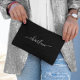 Sacoche d'accessoire de nom de script signature noir et blanc pour vos demoiselles d'honneur. Modifiez la couleur de l'arrière - plan pour qu'elle corresponde à votre palette de mariages. Si vous modifiez la couleur de police blanche, vérifiez que vous customisez également la couleur de l'ombre portée. Le style de police est un script de calligraphie manuscrit moderne et élégant.