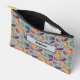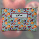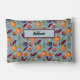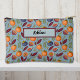 This pomegranate, orange, and fern accessory pouch features a repeating fruit and floral pattern, similar to British 1800 vintage textiles. The retro colors include orange, plum purple, and green ferns on a dusty blue background. This pouch is personalized with your name or other desired text. Make sure to type the text you want in the Personalize section.