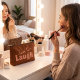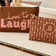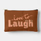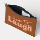 This cheerful peach lettering that says love to laugh, accented by little floral details that are hand drawn, is cute fun way to carry your makeup. The back matches perfectly with vertical peach floral stripes on a rich rust brown background, plus a circle in the center where you can add your own initials. It’s a customizable makeup bag that works just as well for stashing school supplies, travel must‑haves, or everyday essentials. The zipper keeps everything secure, and the design makes it feel personal and fun.