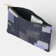 Sac cosmétique bleu foncé avec design traditionnel japonais sashiko imprimé qui ressemble à des points de suture et des patchs.