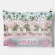 Cette pochette à glissière branchée au bord de la piscine comprend une rangée de chaises longues avec des parasols rayés roses et blancs installés près d'une piscine. Vous pouvez personnaliser avec un nom. Sur le dos est une répétition de la conception avant.