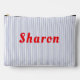 Pochette d'accessoires en lettres rouges rayées bleues.