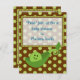 Un adorable petit pois dans une invitation baby shower en crapaud. Un arrière - plan marron avec des points de polka verts et du texte encadré en fait une invitation branchée et amusante. OEuvre vectorielle originale de la ménagerie de Night Owl, 2010.Tous droits réservés.