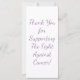 Cette carte à crémaillère présente un poème écrit par le poète Awphul Kristopher Ivie. Il s'agit d'un poème qui utilise la lutte contre le cancer contre les mauvaises herbes. Le poème dit : "Les mauvaises herbes qui prennent des racines / qui se répandent à travers / les empoisonnent, les étranglent / les arrachent". L'empoisonnement et l'étranglement sont des chimio et les arracher à la chirurgie. La prochaine étape "Les mauvaises herbes enfouies profondément / Les graines vénomiques / Nous trouver, nous lier / Faire saigner" souligne le défi de l'éradication complète. La troisième étape, "Raid nos maisons / Sown dans nos champs / Résistez-le, attaquez-le / Faites-le céder", porte sur nos efforts pour éliminer les agents cancérigènes et améliorer la prévention du cancer. La dernière étape, "Continuer à tirer les mauvaises herbes / Garder l'espoir en vie / Nous croyons, Nous réussissons / Nous survivons" est de battre le cancer. L'image arrière - plan est celle d'une petite partie du jardin contre une clôture en bois avec un rack, une houe, un seau et des gants entre les plantes de poivre et la clôture. Il y a des rubans attachés aux plantes ainsi que les instruments. Il y a aussi un plante de tomates sur le côté droit. Il y a aussi un filigrane lavande sur les poignées du rack et du tuyau. Sur le dos est un modèle avec du texte en lettres lavande. La lavande est la couleur de tous les cancers. Le texte arrière par défaut est "merci de soutenir la lutte contre le cancer". Cette carte peut être utilisée comme un remerciement pour ceux qui aident avec une organisation caritative, mais peut être changée pour aussi servir d'encouragement pour ceux qui luttent contre le cancer, pour les médecins et les infirmières, ou pour les survivants.