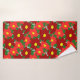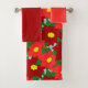 Ce kit de serviettes est muni d'un linge de toilette rouge clair, d'une serviette de bain rouge et d'une serviette de bain avec un motif de Noël de poinsettias regroupés sur un champ de bleu clair.