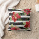 Coussin rayé noir et blanc avec poinsettias rouge, ivoire et vert avec feuillage vert et pinecones pour décorer votre maison pour les vacances.