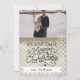 Texte noir qui dit "We Wish You A Joyeux Noël" sur le devant et "and a Happy New Year!" sur le dos avec des points d'argile sur un arrière - plan blanc, des flocons de neige blancs et un cerf en silhouette, et des zones où vous pouvez ajouter votre nom de famille et votre photo sur une carte de voeux de Noël, vous êtes sûr de vouloir envoyer famille et amis!