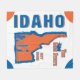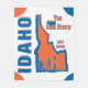 Les caractéristiques de conception de l'Idaho une illustration d'un personnage de dessin animé de sac à pomme de terre traînant sur la typographie lisant le surnom de l'Idaho, "l'état de gemme", une silhouette de l'horizon année de Boise, et de l'Idaho de statehood.