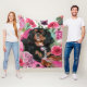 Manette en peluche en peluche en tissu blanc noir et tan cavalier roi charles spaniel. arrière - plan floral, aux fleurs roses, roses, oeillets.