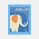 Couverture mignonne d'ouatine pour le bébé ou l'enfant en bas âge. L'éléphant pulvérise l'eau de son tronc avec deux oiseaux bleus regardant dessus. Arrière - plan bleu. Ajoutez le nom de votre enfant.
