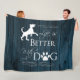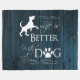Restez à l'aise lors des soirées fraîches d'automne avec une Life is better with a Dog Fleece Blanket. Le design de couverture comprend un texte qui dit "La vie est meilleure avec un chien." avec un empreinte de patte et une silhouette de chien orné contre un arrière - plan en bois rustique bleu profond. Autres cadeaux disponibles avec ce design aussi.