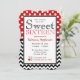 Le style bracket, les invitations d'anniversaire Sweet sixteen avec des pois blancs sur le rouge sur la moitié supérieure et un motif zigzag en chevron noir et blanc sur la moitié inférieure. Personnalisez avec les détails de la fête et choisissez votre type de papier aussi!