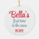 Ornement céramique personnalisé de caniche doré. Personnaliser à l’arrière : la première fois de Bella dans la neige 2022.