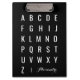Ce porte - bloc moderne présente les lettres de l'alphabet en caractères blancs gras sur un arrière - plan noir. Vous trouverez ci-dessous un espace à personnaliser avec votre nom dans la calligraphie script tendance. Une belle façon d'ajouter un style minimaliste à vos fournitures scolaires !