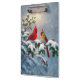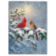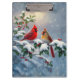 Une paire de cardinaux rouges du nord perchent sur une branche sainte recouverte de baies rouges et de neige.