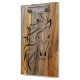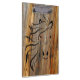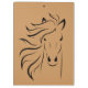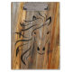 Plaque en bois coloré sur une diagonale recouverte d'un contour de tête de cheval.