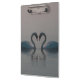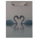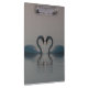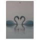 Une superbe photo de deux cygnes nageant tête à tête, créant l'illusion d'un coeur sur l'eau. Ils sont ensemble sur un lac de brouillard tôt le matin,
