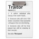Une définition humoristique du terme "traître" est présentée comme une entrée de dictionnaire avec un ton sarcastique, suggérant que le terme désigne un collègue de travail apprécié qui quitte pour un nouvel emploi. Il étiquette avec joie l'employé qui quitte son poste de traître pour avoir laissé des amis derrière lui, mais reconnaît aussi leur potentiel de grandeur dans leur prochain rôle.