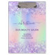 Un arrière - plan holographique branché et irisé aux couleurs pastel rose, vert menthe violet. Décoré de confettis. Un porte - bloc pour les maquilleurs, les designers de cheveux, les salons de coiffure et de beauté, les infirmières. Lettres violettes. Personnalisez et ajoutez votre nom et vos coordonnées. Le nom personnel est écrit avec un script de style moderne écrit à la main avec des swashes. Pour que les swashes ne suppriment que le nom de l'échantillon, laissez les espaces ou émoticônes devant et après le nom. Supprimer si non voulu.
