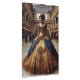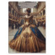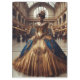 Debout dans une grande salle vintage ou peut-être une gare vintage, un peu hors de sa place, cette dame victorienne steampunk Gold brille en bleu et or avec des engrenages à horloge tissés dans son élégante robe d'imaginaire sur cet ajout à n'importe quel bureau à domicile.