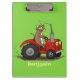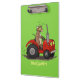 Cette drôle de vache brune conduit un tracteur rouge. Beaucoup de plaisir pour les fermiers ou les amateurs de vache!