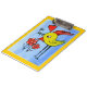 Peinture acrylique qui montre un oiseau jaune à pattes longues avec des plumes rouges et un bec rouge regardant deux fleurs rouges. L'arrière - plan a été peint en bleu clair. Le tableau est encadré par un arrière - plan jaune, le même jaune que sur le dos du porte - bloc.