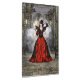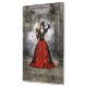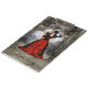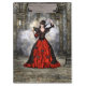 Rendu numérique 3D d'une belle sorcière féminine dans une robe rouge et noire avec des ailes sur un imaginaire éffrayant château arrière - plan