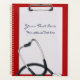 Un design professionnel de classe à usage médical : un porte - bloc en cuir rouge avec papier vierge et un stéthoscope. Parfait pour toute entreprise liée à la santé et aux soins de santé comme un bureau médical, un cabinet médical, une clinique ou un hôpital. Pour le personnel hospitalier, les médecins, les infirmières; classe, noble et élégant.