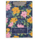 Beautiful floral clipboard for your small business, perhaps a beauty salon, spa, nail salon, hair salon or interior design business. The personalized clipboard has a lush large scale floral pattern printed on the cover in vibrant yellow, pink, green, and blue colors, all drawn by hand on a tablet to form a unique floral pattern. Personalize with your name in a thin signature script.
