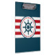 Design nautique avec décoration de voilier en forme ronde avec étoiles sur rouge, bleu et blanc rayé arrière - plan